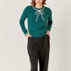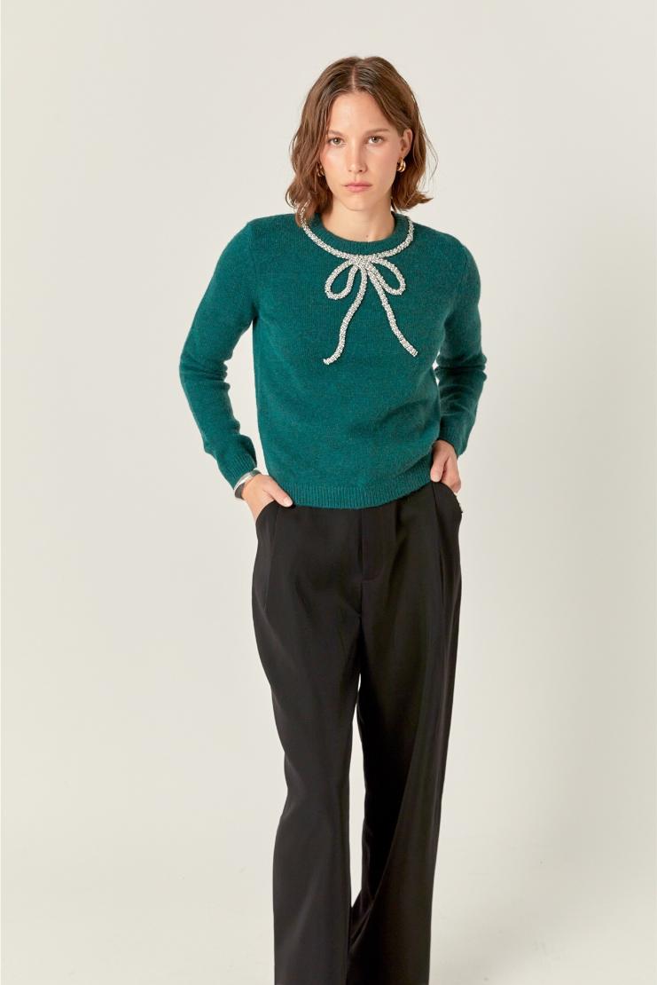 Add some sparkle to your winter wardrobe with our Rhinestone Bow Knit Sweater in green. This playful piece features a rhinestone bow detail, making it the perfect mix of cute and cozy. Stay warm and stylish in our unique and quirky sweater.