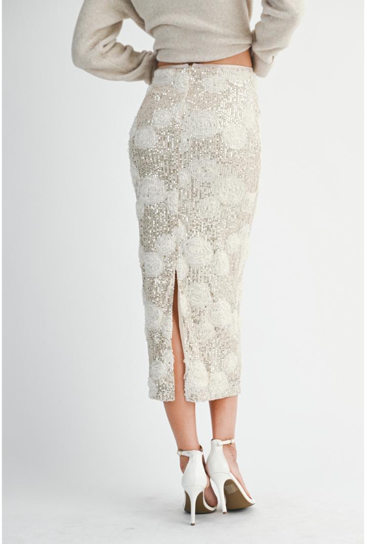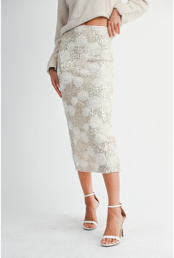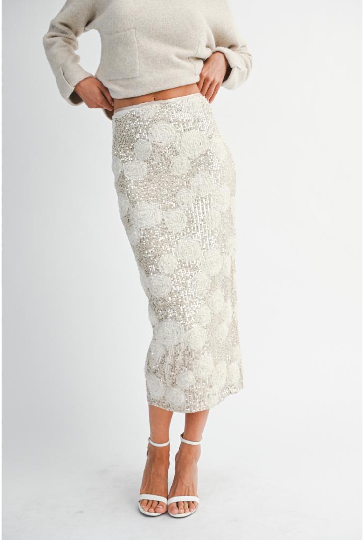 Step into sparkle with the Catherine Floral Embellished Sequin Midi Skirt! This playful skirt dazzles with shimmering sequins and delicate floral details, perfect for turning heads at any event. Its flattering midi length adds a touch of elegance while keeping the fun alive. Pair it with your favorite top and get ready to shine all night long!