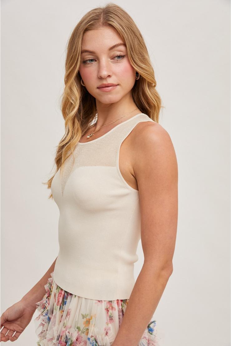 Step up your wardrobe game with our Georgina Sweetheart Mesh Neck Sleeveless Top! Perfect for any occasion, this top features a unique mesh neckline and sweet sleeveless design. Embrace your inner fashionista and rock this Ivory top with confidence.