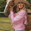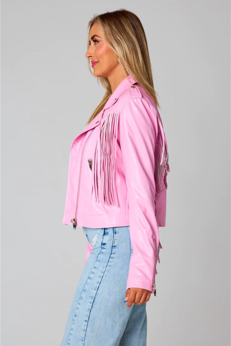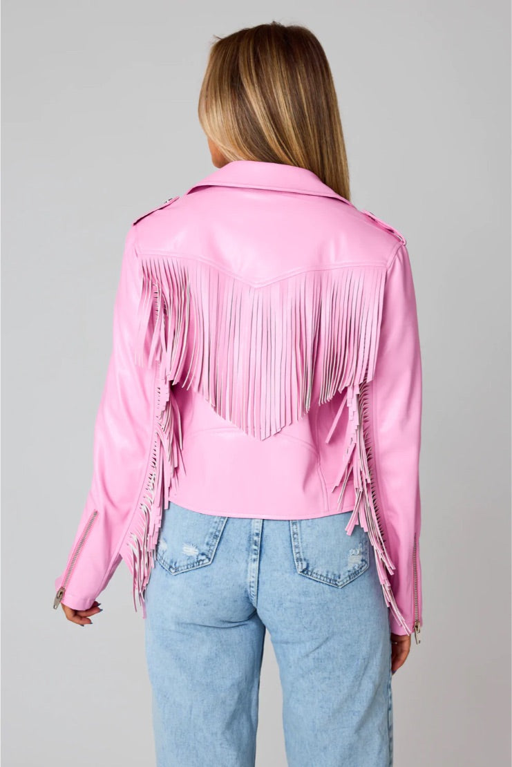 Classic biker style is updated by a Chic Western twist with swishy fringe that cascades down the sleeves and back of this faux-leather jacket.