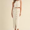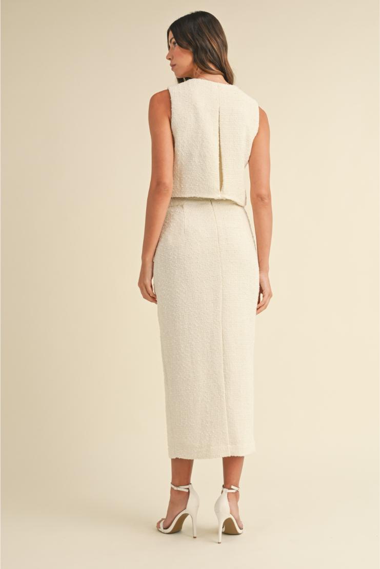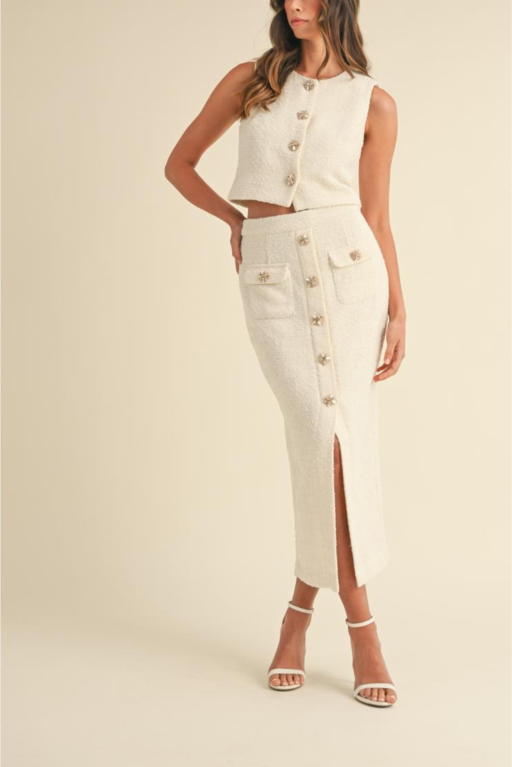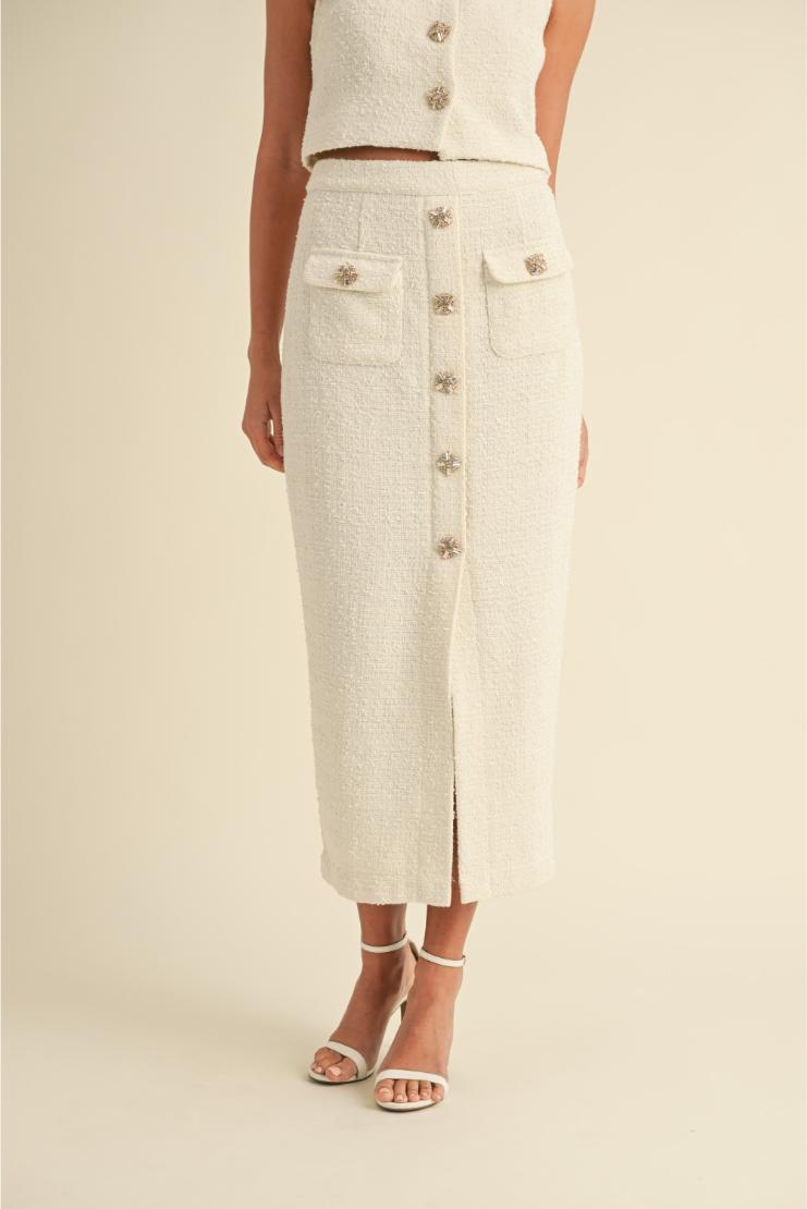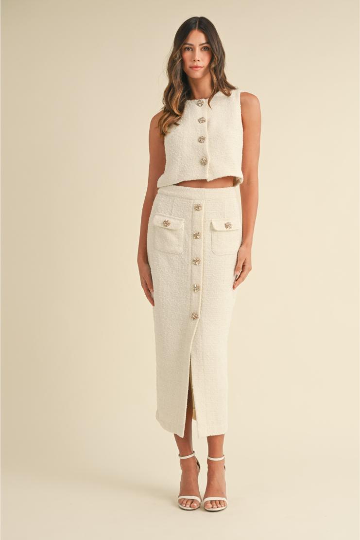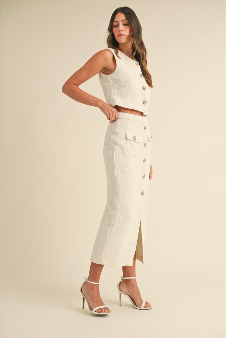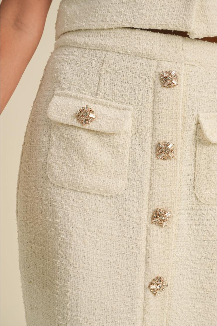 Elevate your wardrobe with our Jackie Tweed Bling Button Crop Top & Midi Skirt Set. Crafted from luxurious, high-quality tweed fabric, this set exudes elegance and sophistication. The sparkling bling buttons add a touch of glamour, making it perfect for any upscale occasion. Mix and match or wear as a set for a chic, exclusive look.