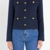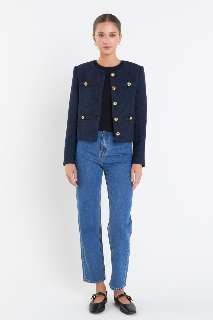 Score some serious style points with our Navy Blue Gold Button Tweed Jacket! This jacket features a classic yet trendy tweed design with shiny gold buttons for a touch of glamour. Perfect for adding a touch of sophistication to any outfit.