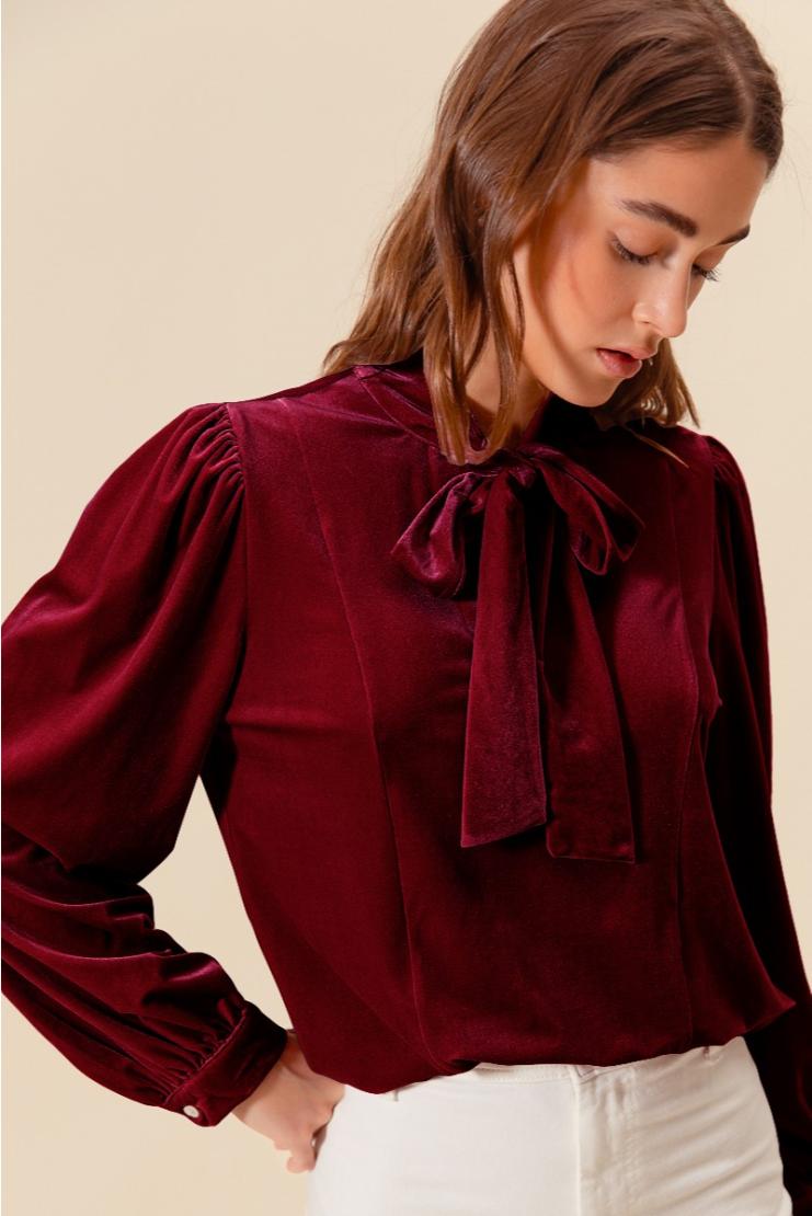 Step up your fashion game with this Burgundy Velvet Bow Tie Neck Blouse. The velvet material adds a touch of luxury, while the bow tie neck and puff sleeves add a playful twist. Perfect for a night out or a stylish office look.