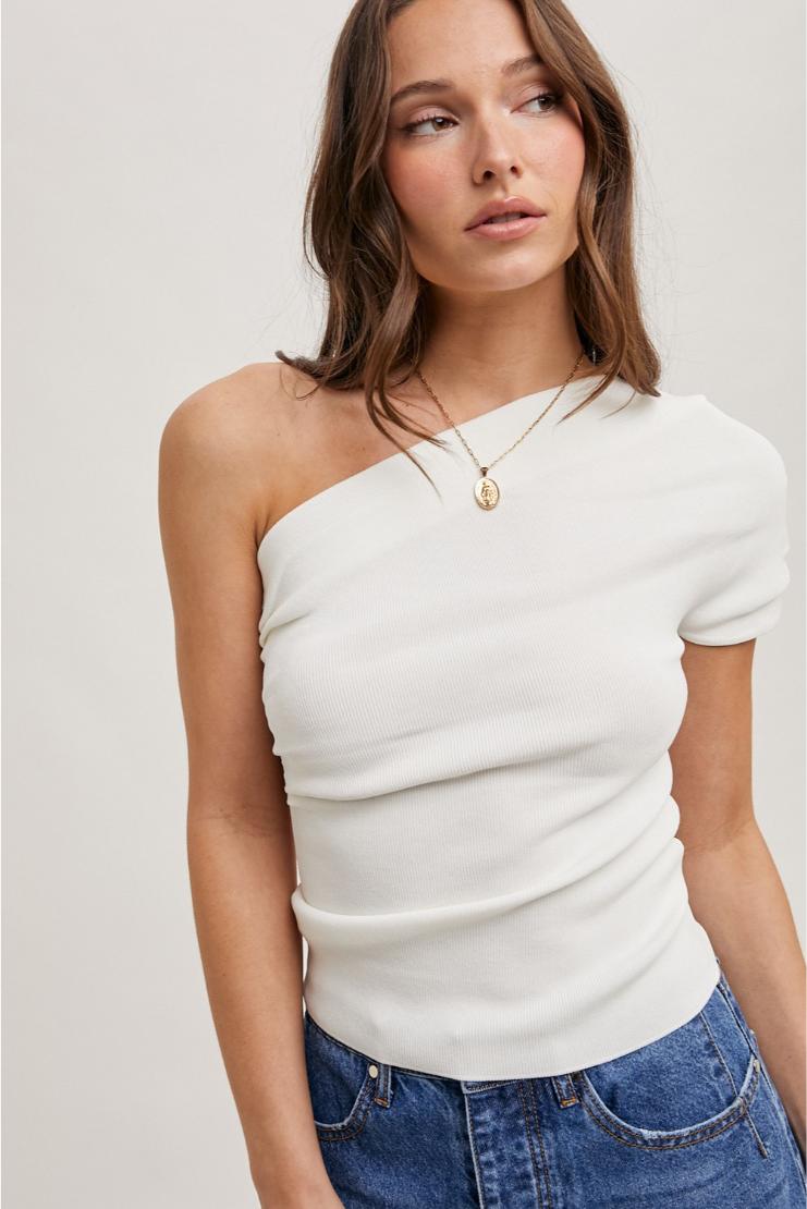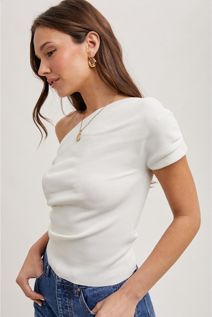 Introducing the Julie Knit Top, the perfect combination of style and comfort. With a draped one sleeve design and asymmetrical hem, this top adds a touch of fun and playfulness to any outfit. Made from soft knit material, it will keep you feeling cozy all day long.