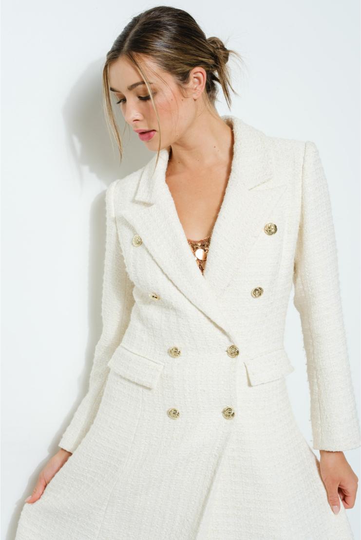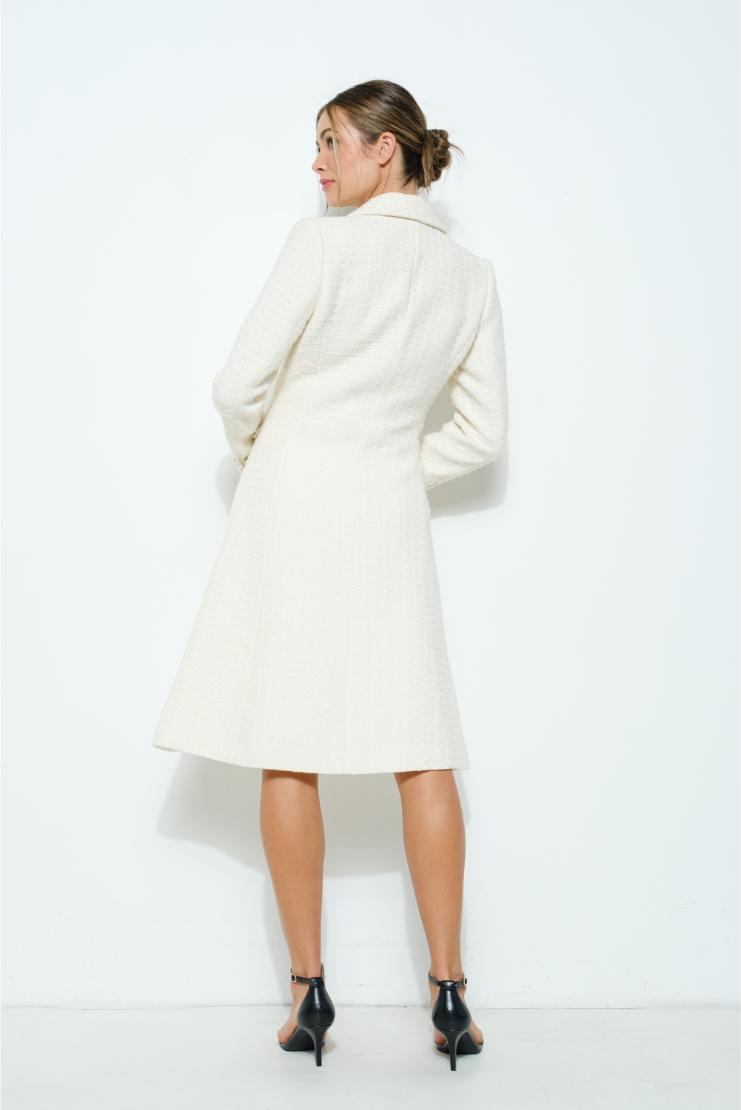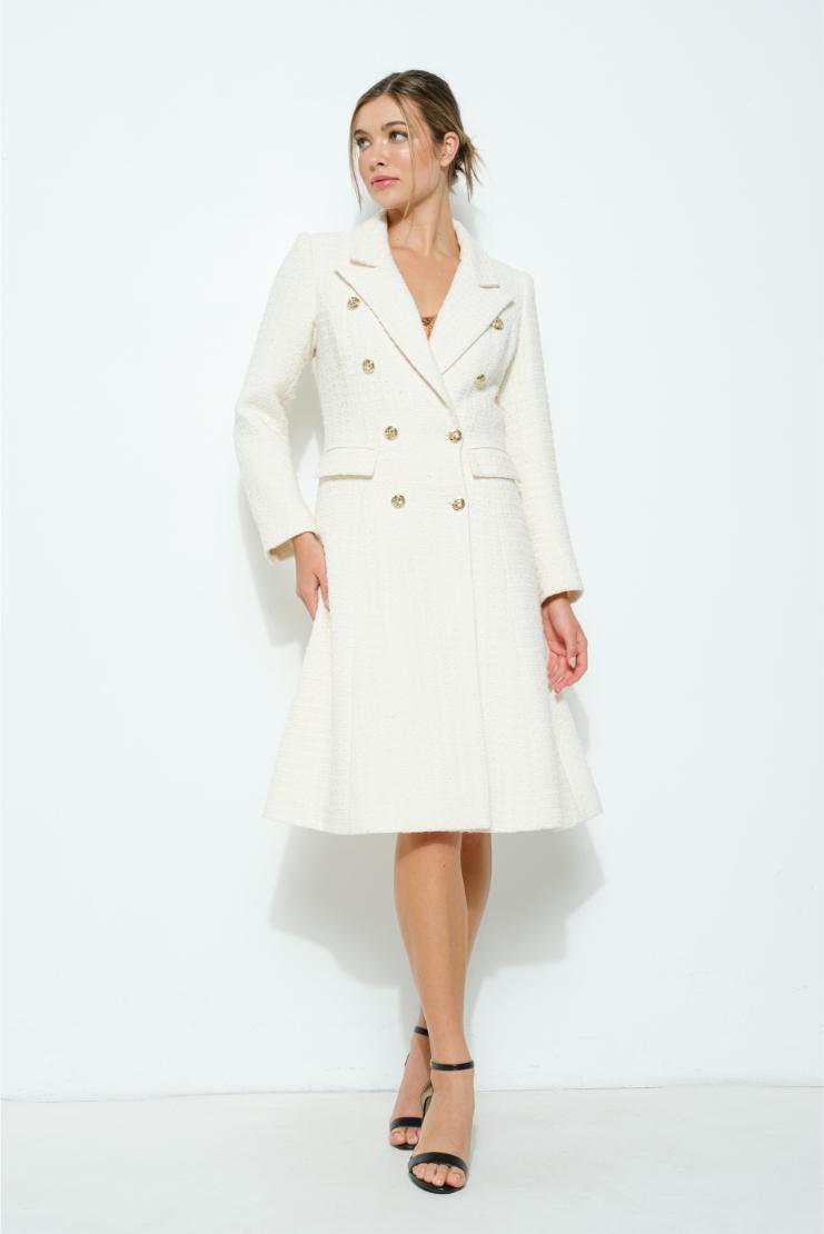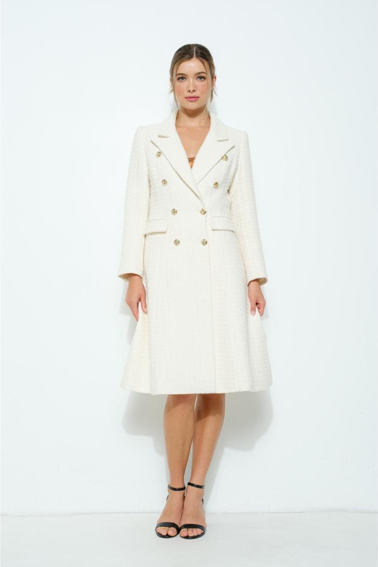 Indulge in luxury with our Kate Tweed Double Breasted Long Coat. This elegant, Ivory coat features a classic double-breasted design and is made with high-quality tweed fabric. It will keep you warm and stylish, perfect for any sophisticated occasion. Elevate your wardrobe with our exclusive coat.