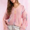 Get ready to stand out with our Layan Rainbow Stitching Detail V-Neck Sweater in pink. This one-of-a-kind sweater features vibrant stitching and a flattering V-neck design. Perfect for adding a pop of color to your wardrobe and keeping you warm in style.