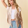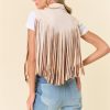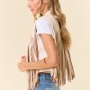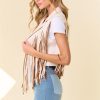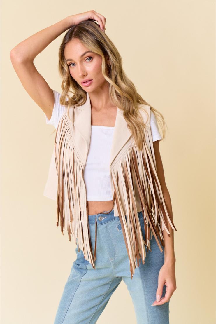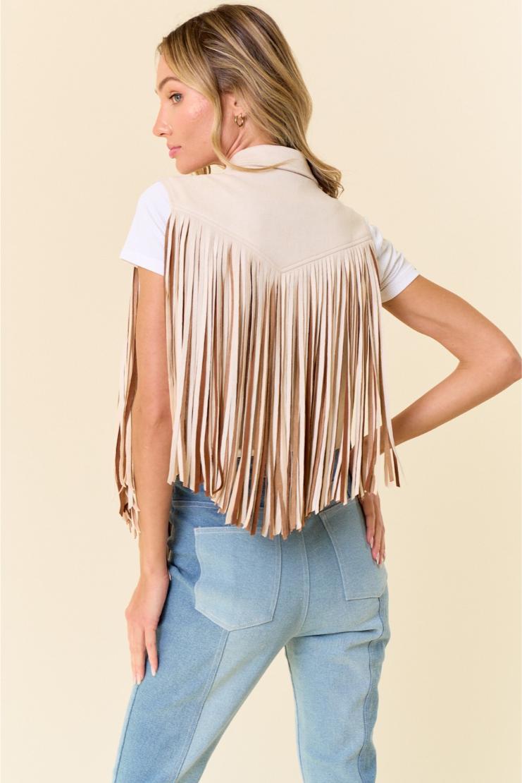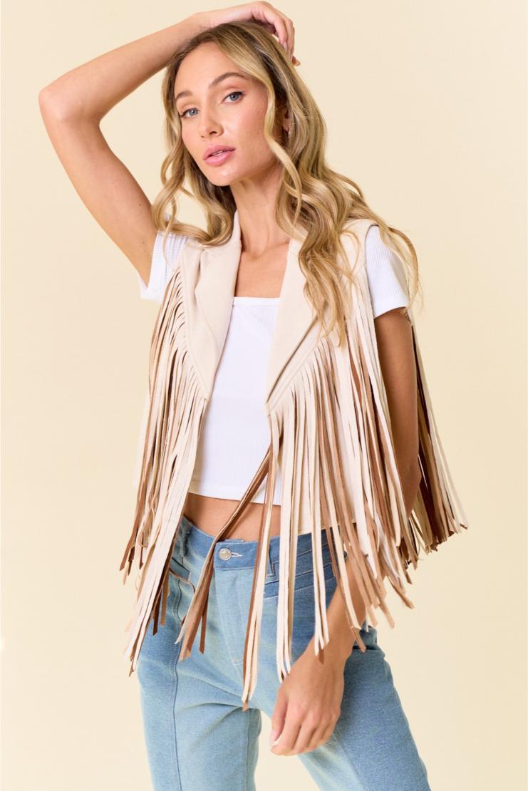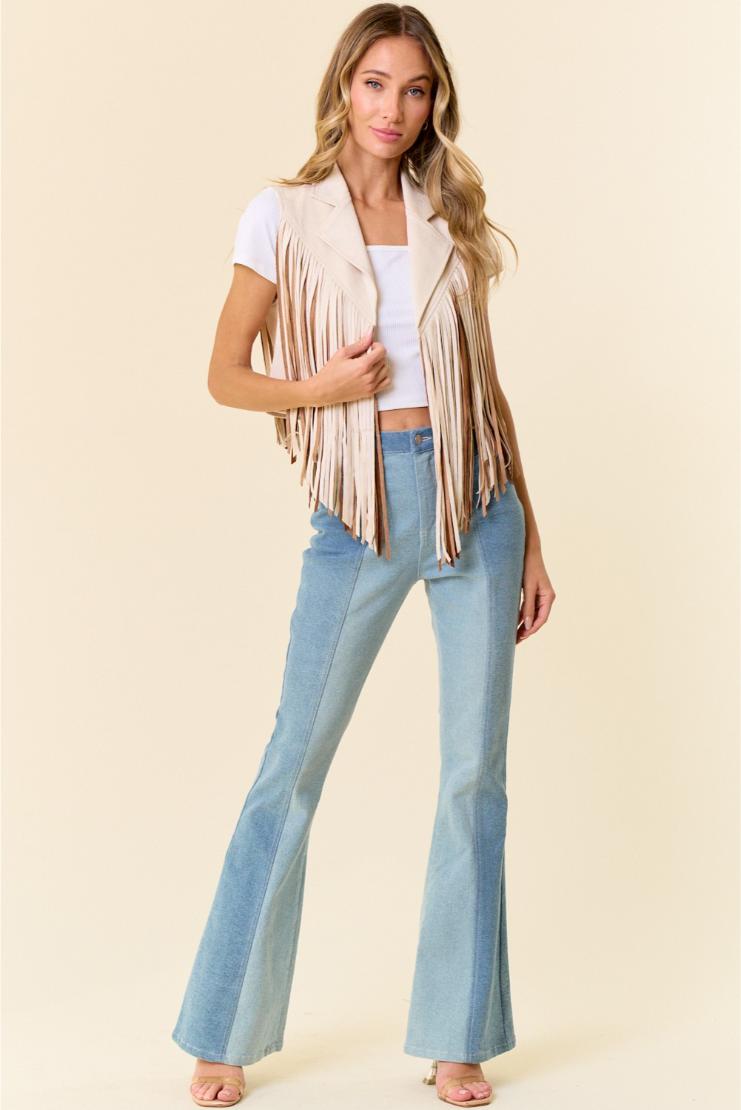 This Regan Suede Contrast Fringe Vest in Ivory is the perfect stylish addition to your wardrobe. Made with luxurious suede and featuring fun fringe detailing, this vest will add a touch of bohemian flair to any outfit. Perfect for layering or as a statement piece, it’s a must-have for any fashion-forward individual.