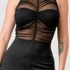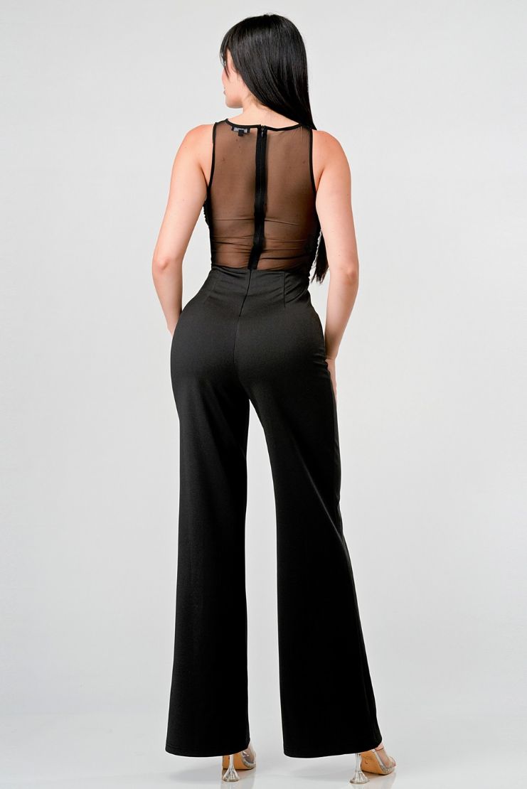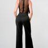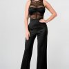 Give your LBD the night off and opt for this show stopping jumpsuit that pairs a sheer-lace bustier bodice and flow-y wide-leg satin pants.