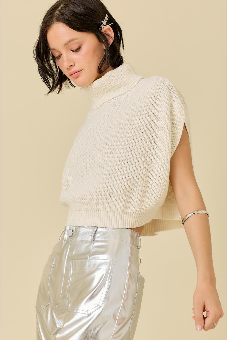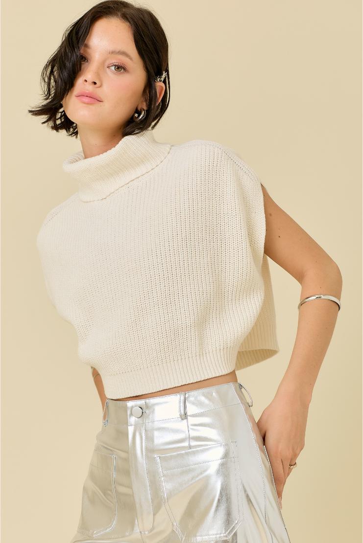 Elevate your wardrobe with our Ivory Sleeveless Boxy Turtleneck Cropped Sweater. With its sleek turtle neck and boxy silhouette, this sweater exudes sophistication and luxury. The cropped length adds a touch of playfulness, making it perfect for any occasion. Stay fashion-forward and comfortable all day long.