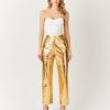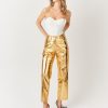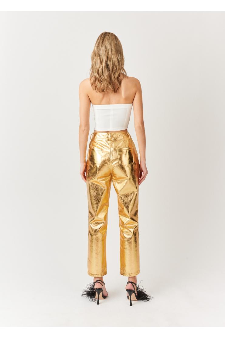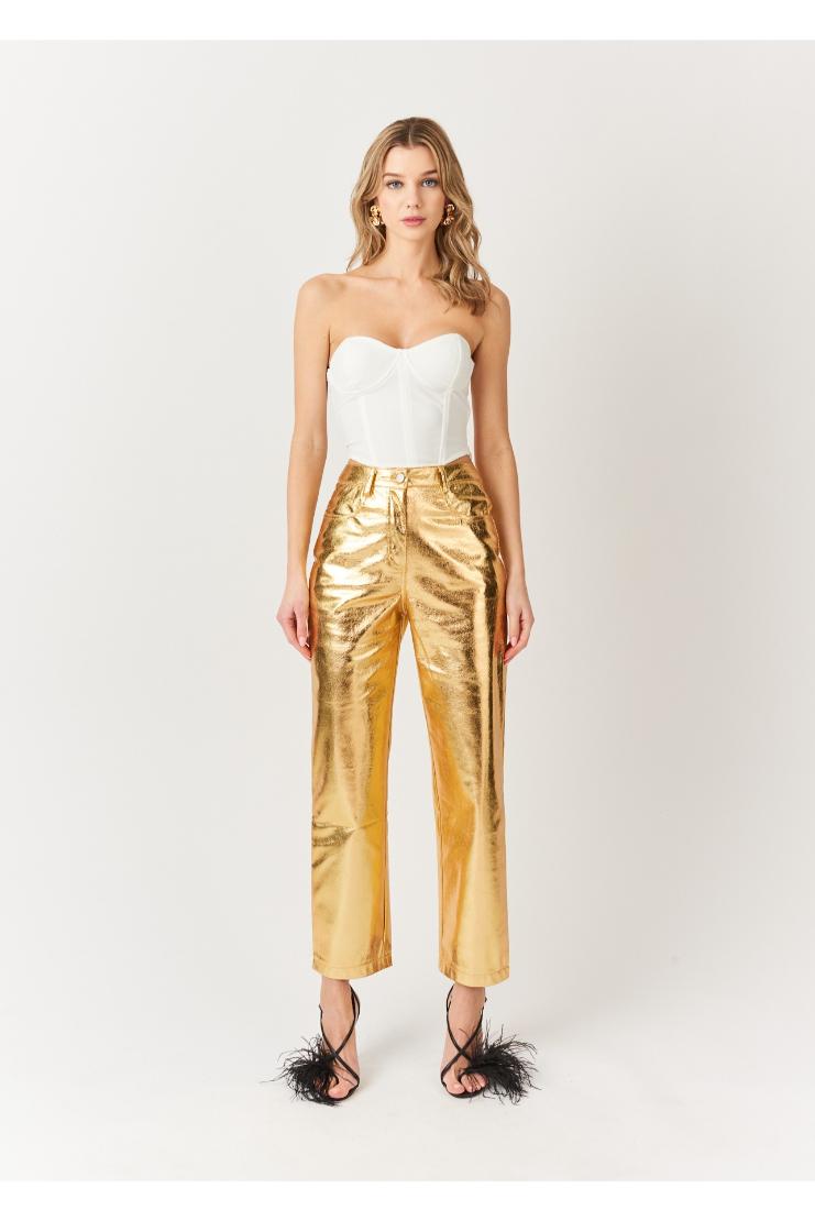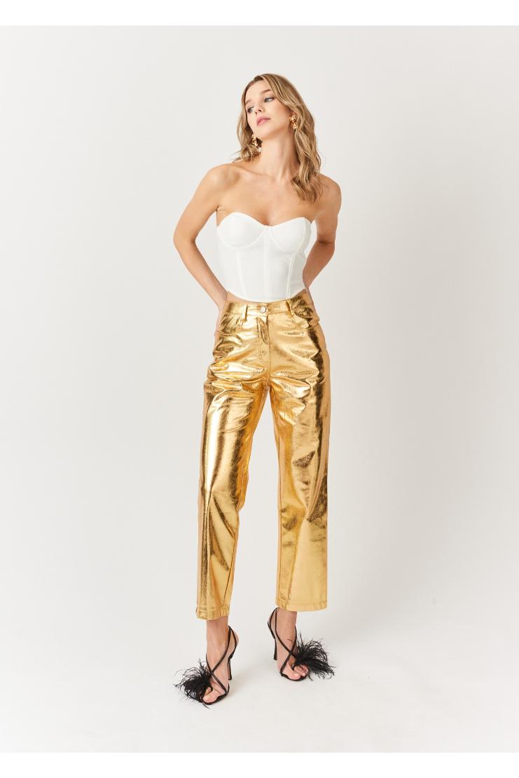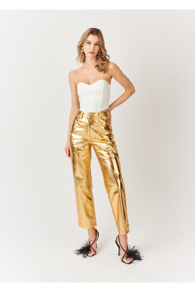 Shine like a star in our Zoey Gold Metallic Pants. These pants add a touch of glamour to any outfit, making you feel like a fashion icon. Stand out from the crowd with these stylish and eye-catching pants, perfect for any occasion. Embrace your inner diva with Zoey Gold Metallic Pants!