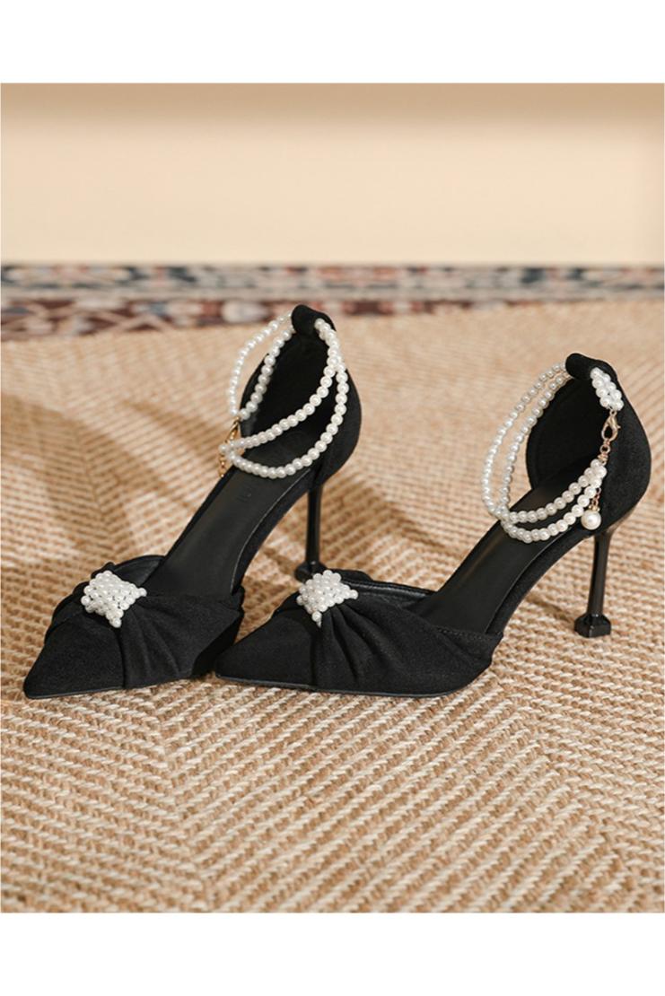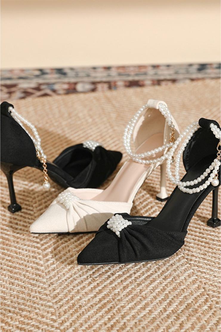 Add some “sole” to your shoe collection with the Audrey Velvet & Pearl Pointed High Heel. These elegant heels are perfect for any special occasion and feature a luxurious velvet exterior, delicate pearl accents, and a pointed toe for a touch of sophistication. Step out in style and comfort with these unique and playful heels.