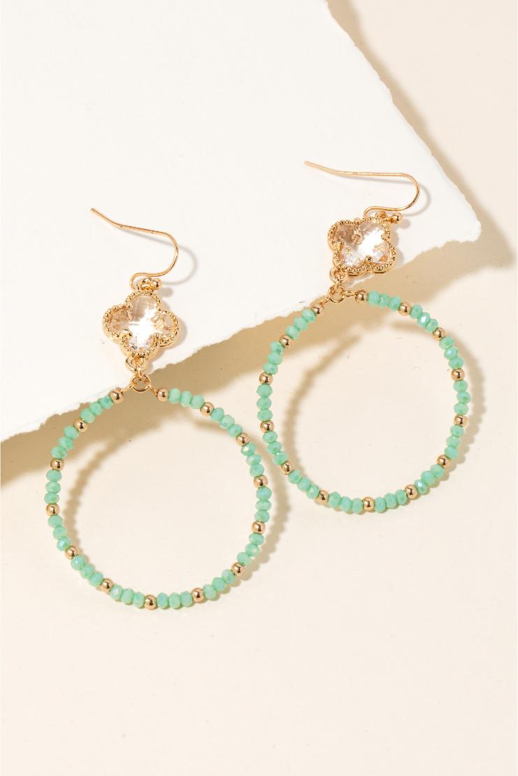Add a touch of whimsy to your outfit with the Clover Gem Mini Beaded Hoop Drop Earrings. These playful earrings feature a vibrant mint color and delicate beading in a clover shape, making them the perfect accessory for any fun and carefree look.