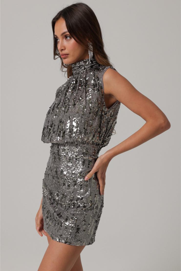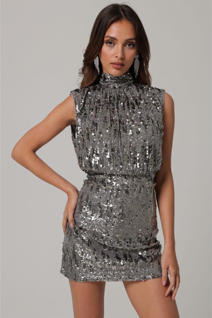 Sparkle like a diamond in our Gunmetal Silver Metallic Sequin Mini Dress. This stunning dress features dazzling gunmetal silver sequins, perfect for turning heads at any event. With its figure-hugging silhouette, you’ll feel confident and chic all night long. Take your wardrobe to the next level with this show-stopping dress. (Gunmetal silver sequins, figure-hugging silhouette, eye-catching design, perfect for any event)