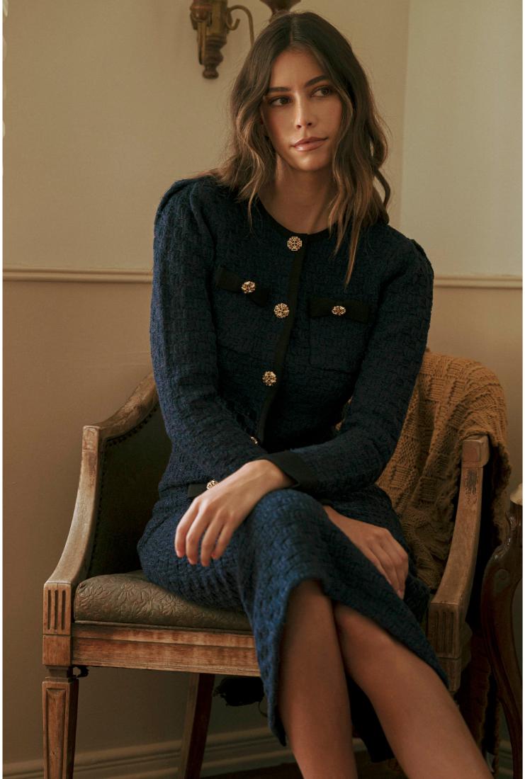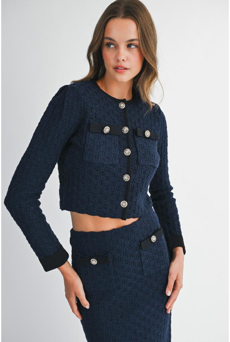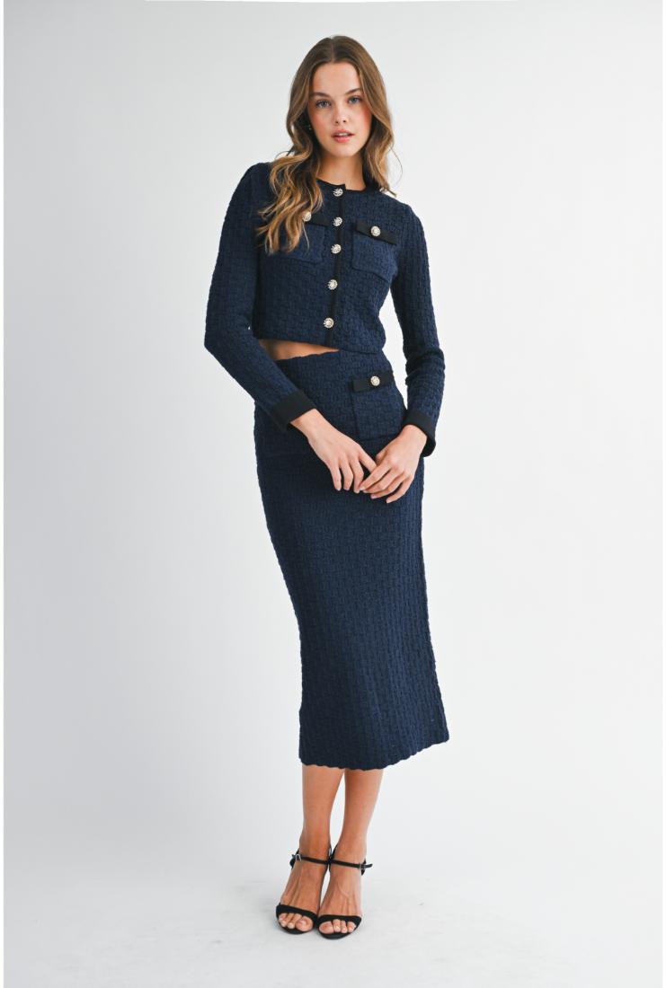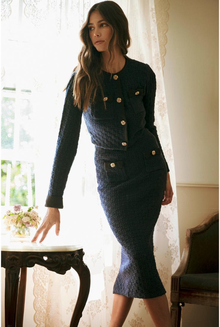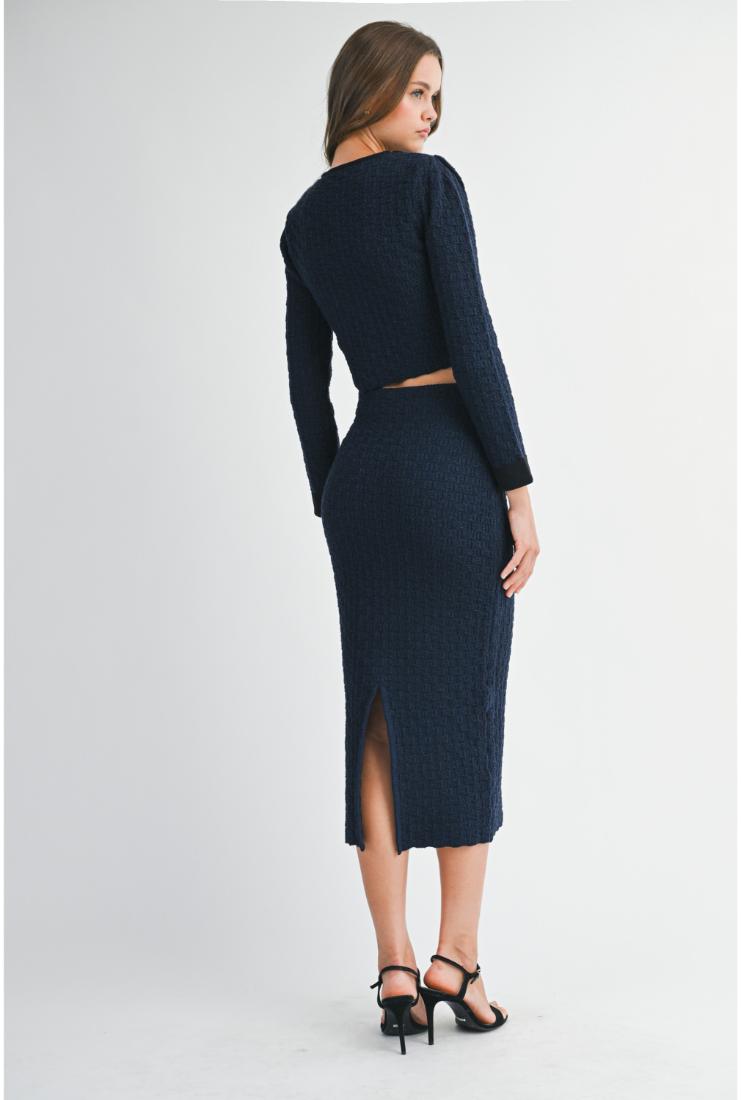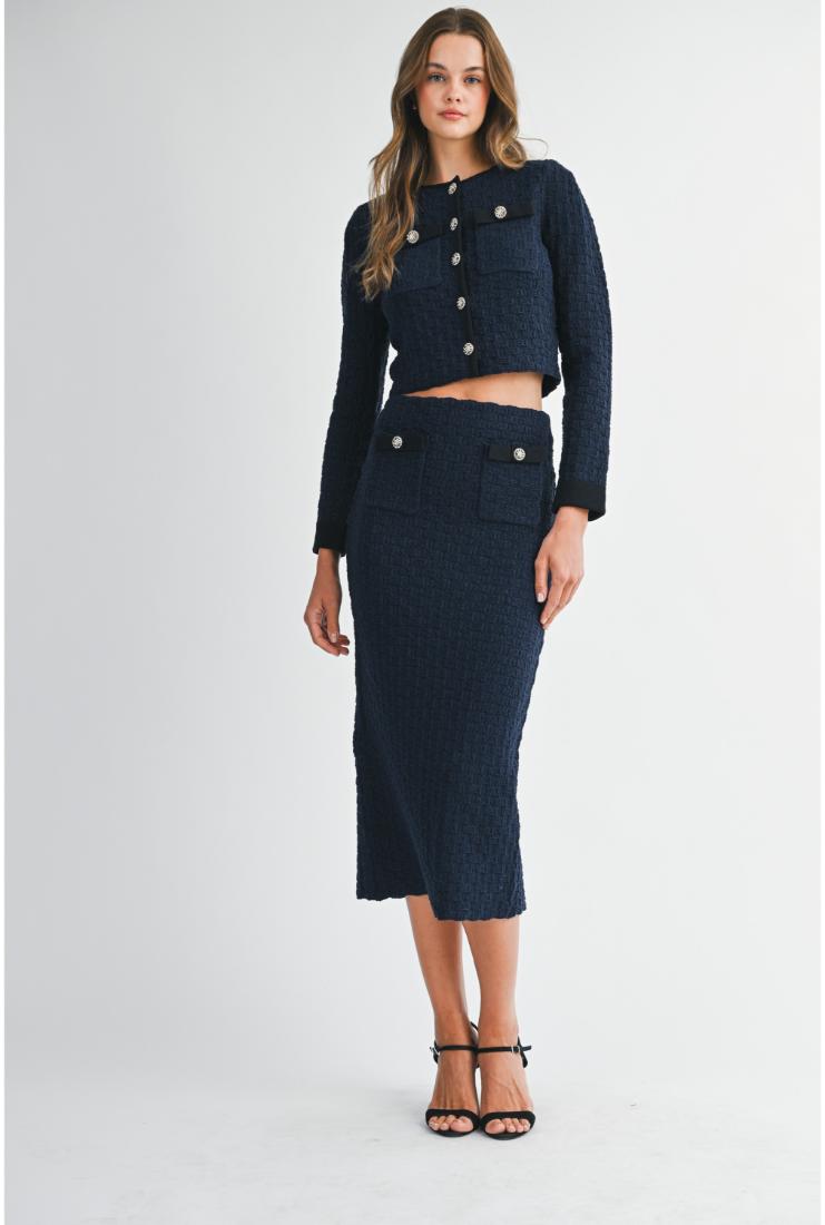 Elevate your wardrobe with the Adeline Long Sleeve Crop Jacket and Midi Skirt, each sold separately for versatile styling. The tailored crop jacket offers a refined silhouette with long sleeves, perfect for layering or standalone elegance. Complement it with the midi skirt, designed to flatter with a sleek, sophisticated cut. Together or apart, these pieces provide timeless sophistication for any occasion.