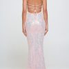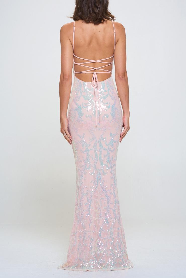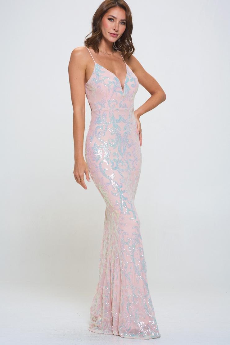 Old Hollywood glamour makes an appearance in this dazzlingly sequined dress updated with sequin pattern design that bares tantalizing peeks of skin.