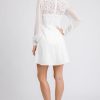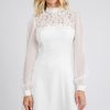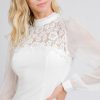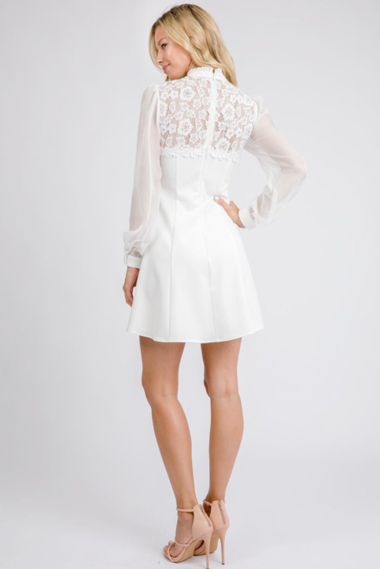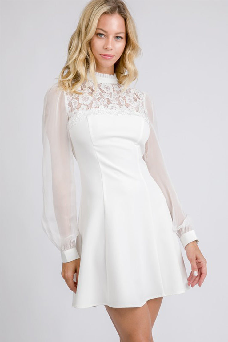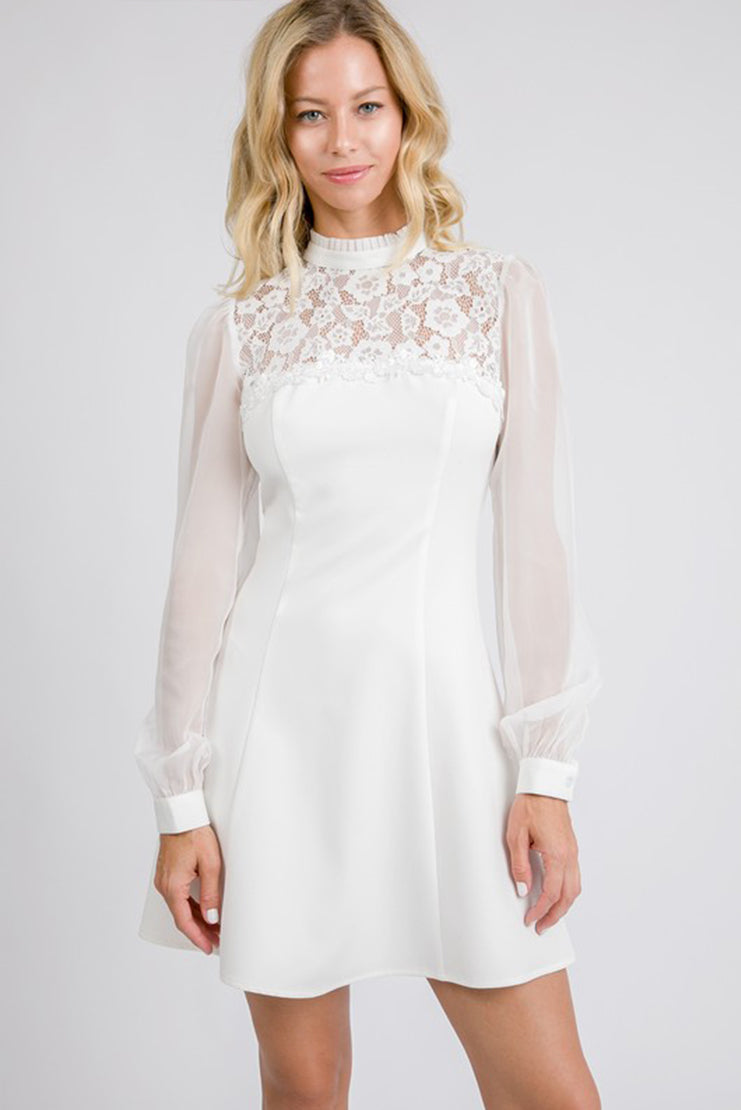 Lovely floral lace with scalloped edges brings romantic charm to this princess-seamed dress styled with cuffed see-through long sleeves and a flouncy skirt for twirling over the dance floor.