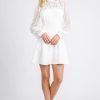 Lovely floral lace with scalloped edges brings romantic charm to this princess-seamed dress styled with cuffed see-through long sleeves and a flouncy skirt for twirling over the dance floor.