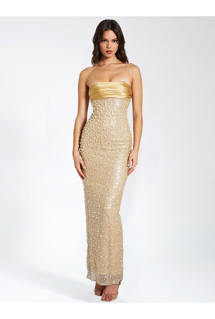 Step into the spotlight with the Marilyn Gold Satin Sequin & Pearls Maxi Dress. This dazzling gown combines shimmering gold sequins with delicate pearl accents, creating a captivating glow that’s perfect for any festive occasion. The smooth satin fabric glides over your silhouette, while the maxi length adds a touch of elegance and drama. Celebrate your unique sparkle and dance the night away in style!