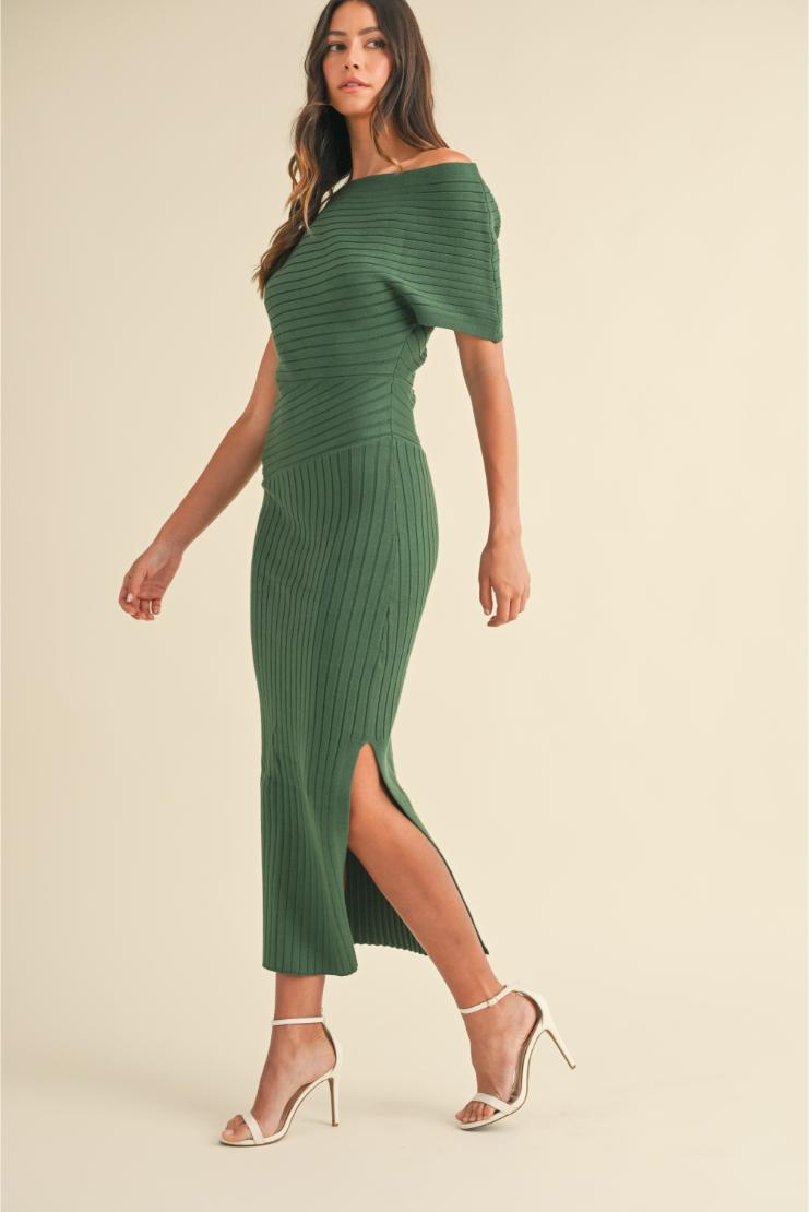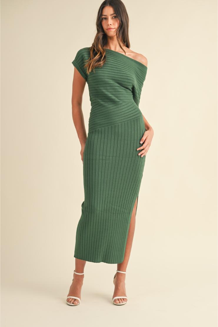 Get ready to turn heads in our quirky One Shoulder Knit Midi Dress! Featuring a playful off-shoulder design and a trendy ribbed knit texture, this dress also includes a side slit for added comfort and style. Perfect for a night out or a casual day, this dress is a must-have addition to your wardrobe.