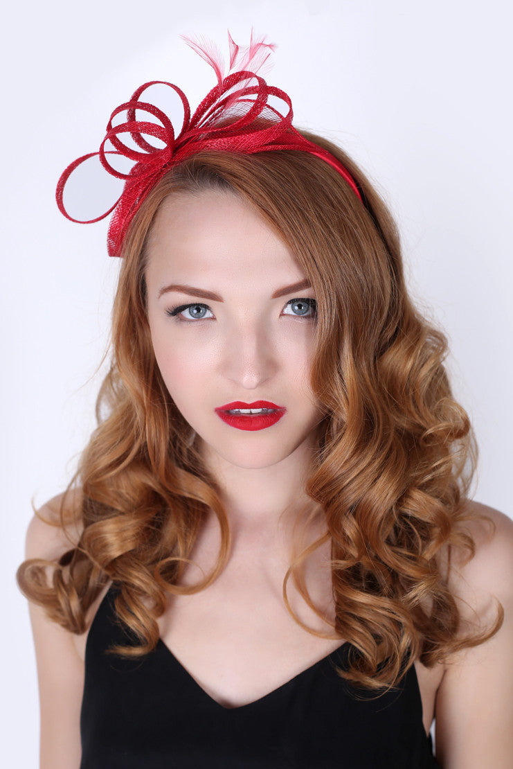 Time to be stylish and fashion forward with a twist of a fascinator. A modern fascinator so unique, this little addition will set you apart from your friends. Twisted mesh loops and a few flighty feathers will add that finishing touch to your cute little sundress. Complete with a headband for easy adornment, get ready to shine.