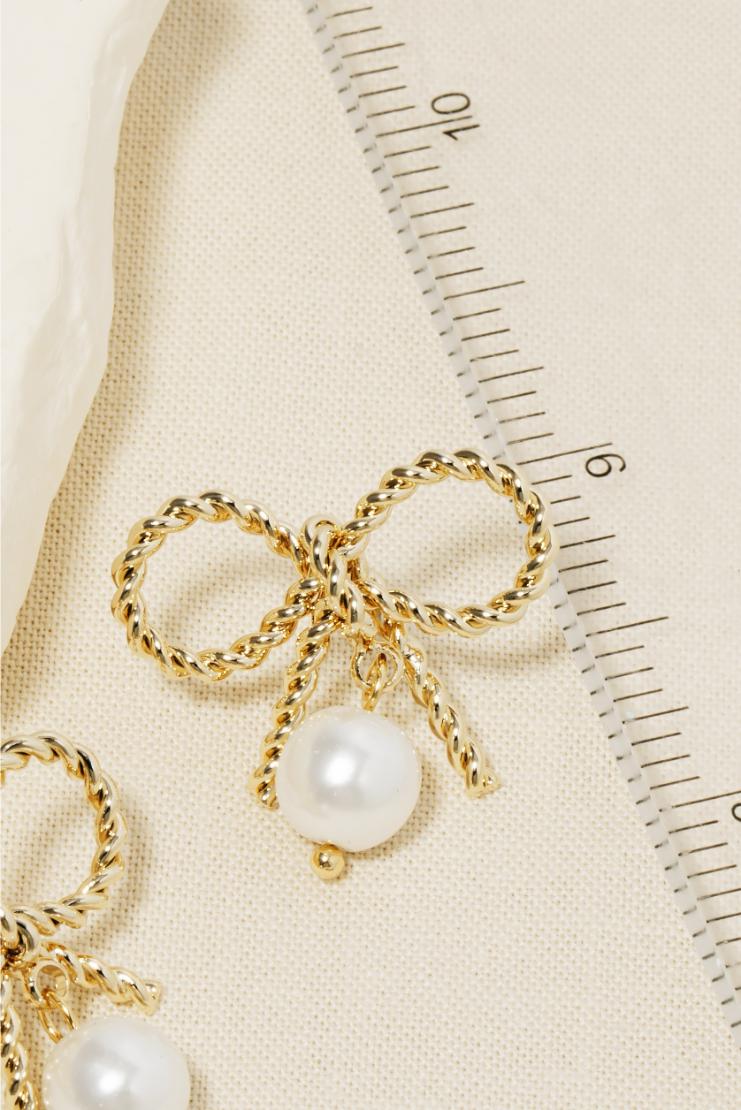 Add a touch of whimsy to your look (without breaking the bank) with these Gold Bow and Pearl Charm Stud Earrings. The twisted ribbon bow design adds a playful element, while the pearl charm adds a touch of elegance. Perfect for any occasion!