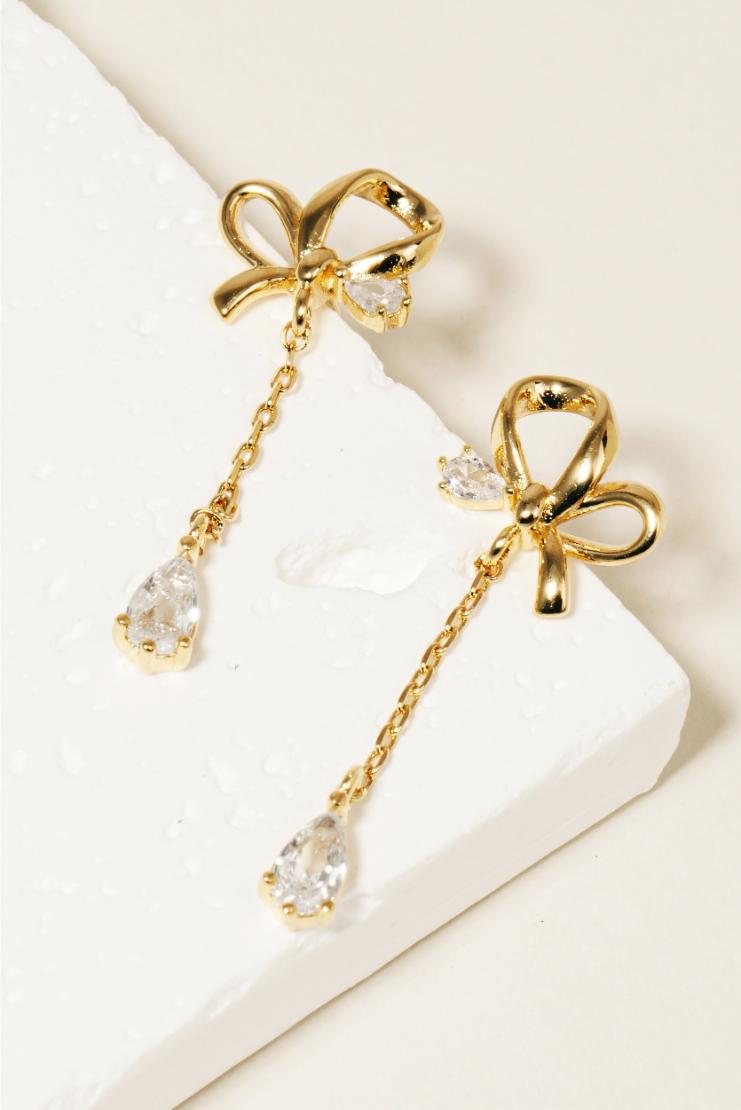 Sparkle and shine with these Gold Bow Chain Rhinestone Earrings! The delicate chain and gold bow design adds a touch of elegance, while the rhinestones bring the bling. Perfect for a night out or adding some glam to any outfit. (No need to spend a fortune to look like a million bucks!)