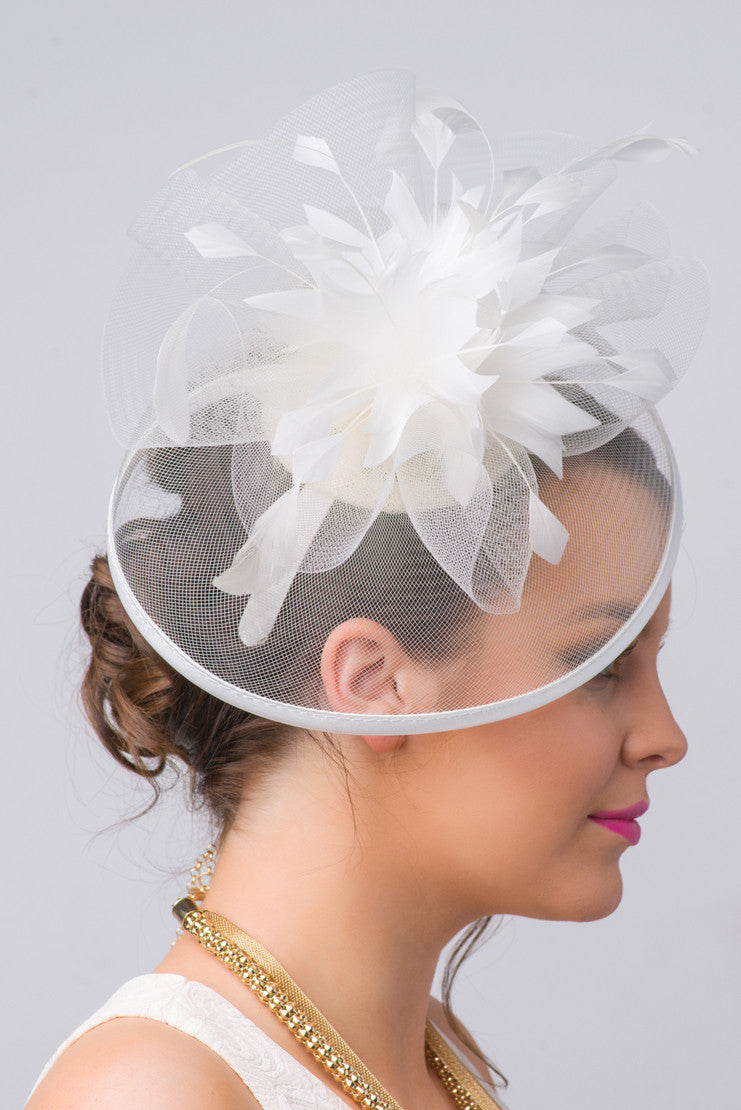 You are a picture of glamorous sophistication when you put on this romantic fascinator! Modern with a vintage touch, this elegant horse hair mesh base adorns a beautiful bouquet of soft feathers. A soft satin trim offers and allure that’s simply breathtaking.