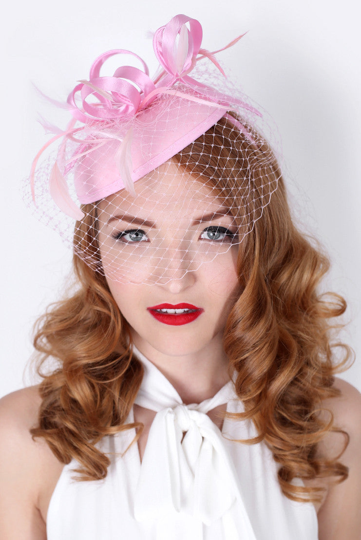 Be the envy of the party in this elegant felt fascinator. The round felt base is covered with satin ribbon loops, adorned with flighty feathers and topped off with a birdcage veil. This gorgeous piece is perfect for any special occasion.