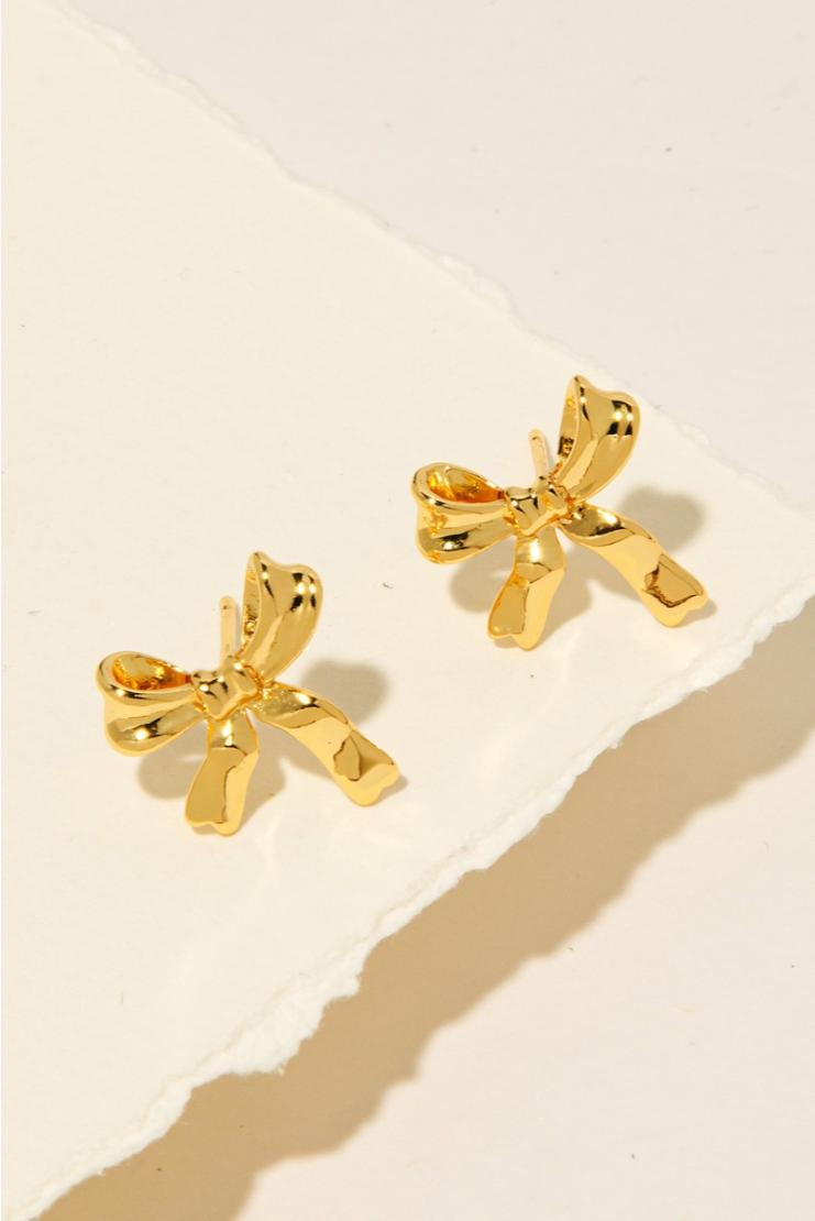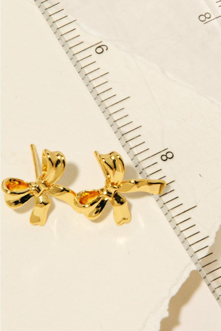 Add some playful sparkle to your outfit with our Metallic Ribbon Bow Stud Earrings in Gold! These unique earrings feature a delicate bow design that adds a touch of whimsy to any look. Perfect for adding a fun and quirky touch to your accessory collection.