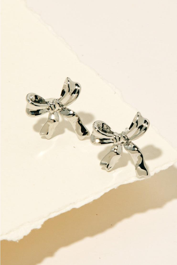 Add a touch of whimsy to any outfit with these playful Metallic Ribbon Bow Stud Earrings. The metallic finish adds a glimmer of shine, while the ribbon bow design adds a fun and flirty touch. Perfect for those who want to elevate their style with a touch of whimsy and sparkle!