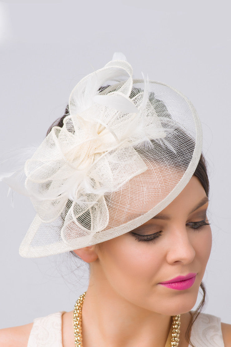 Timeless glamour. This sassy fascinator gives a nod to vintage style with a bouncy mesh ribbon and flighty feathers. With its classic sinamay mesh shape and elegant look it will be your go-to fascinator for the season.