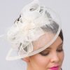 Timeless glamour. This sassy fascinator gives a nod to vintage style with a bouncy mesh ribbon and flighty feathers. With its classic sinamay mesh shape and elegant look it will be your go-to fascinator for the season.