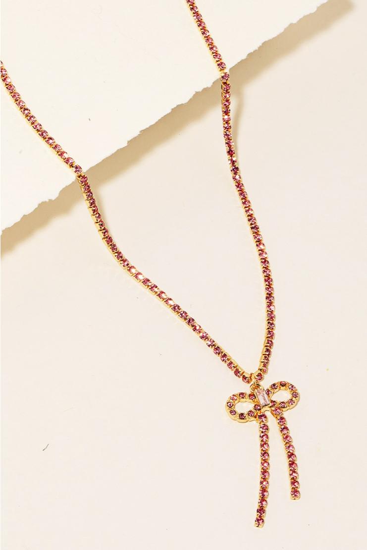 Add a pop of sparkle with this Pink Rhinestone Gold Chain And Ribbon Bow Pendant Necklace. The playful ribbon bow pendant adds a touch of whimsy to your outfit. Perfect for those who love to add a little fun to their everyday look. (Slightly understated, but in a good way!)