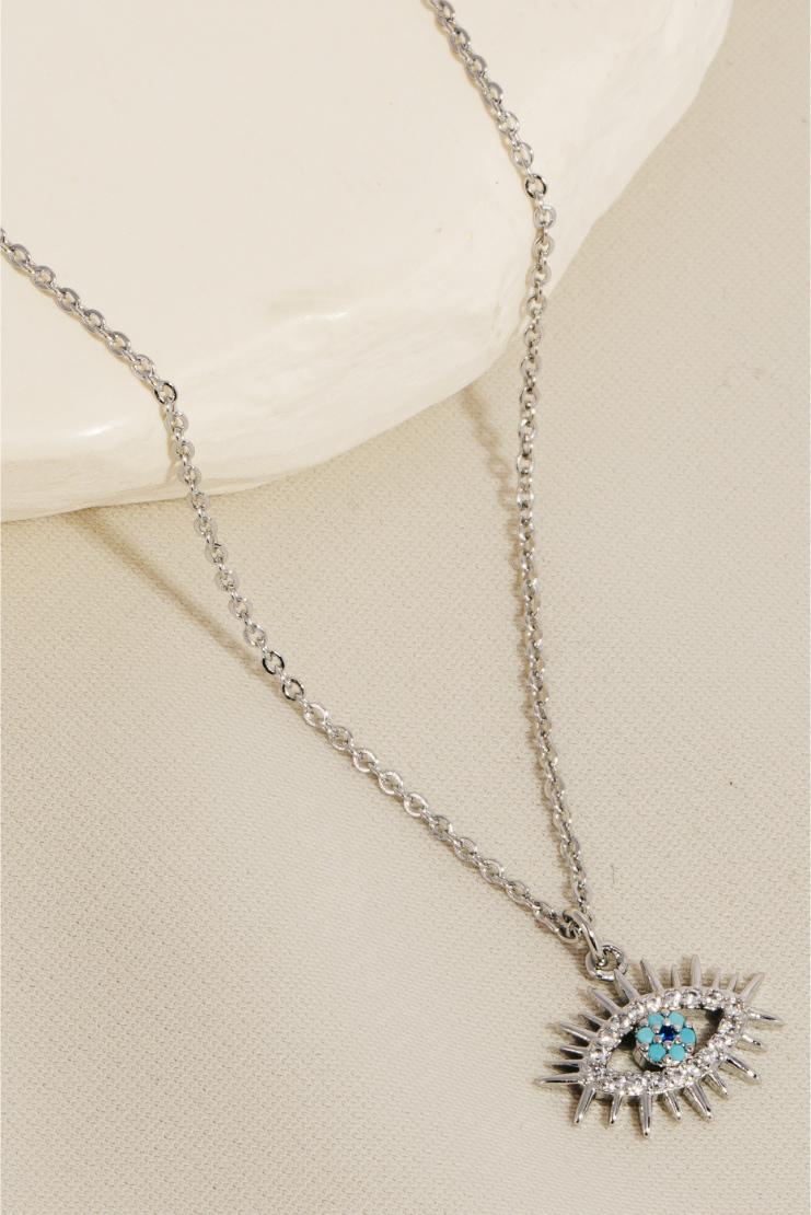 Ward off bad vibes with this Silver Pave Evil Eye Pendant Necklace. This fashionable necklace features a stunning evil eye pendant embellished with shimmering pave crystals. A stylish and playful addition to any outfit, perfect for the quirky fashionista in your life.